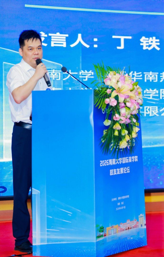 丁铁作为校友代表在发言中深情回顾了自己初入海南大学的求学岁月,感恩母校培养。他介绍,国际商学院校友会成立后,已积极走访广州、深圳、上海、厦门等多地校友会,已建立12个“校友之家”,为广大校友搭建情感联络与互助平台。他动情呼吁广大校友支持校友工作,紧抓海南自贸港机遇,多与学校互动,积极奉献想法与资源。