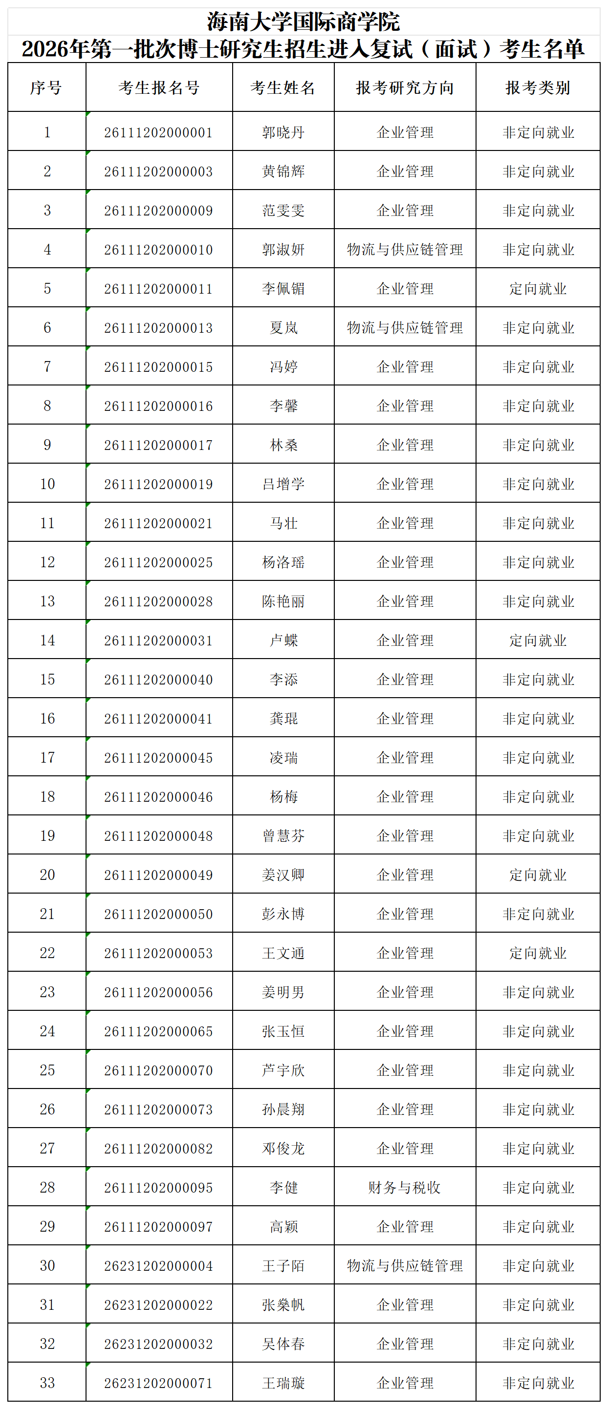 海南大学国际商学院2026年第一批次博士研究生招生进入复试(面试)考生名单