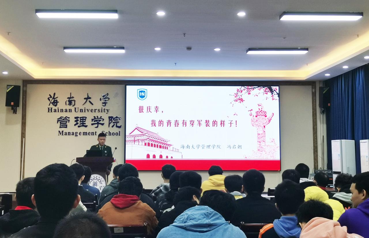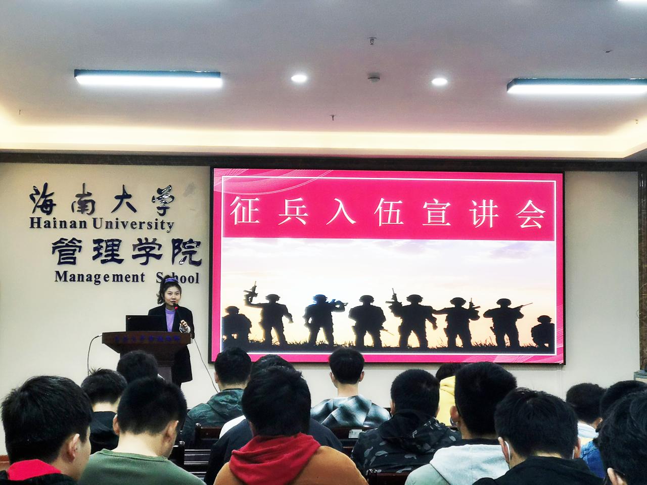 为推进应届毕业生应征入伍工作,帮助了解、掌握应征入伍相关政策和流程,鼓励积极应征入伍,献身国防事业2021年12月27日上午,管理学院于社科楼B112教室举行应届毕业生征兵入伍宣讲会。党委副书记易振、学生工作办公室主任肖亚奇、辅导员黄瑜、退役大学生代表冯启朝、2018级应届毕业生代表参会。