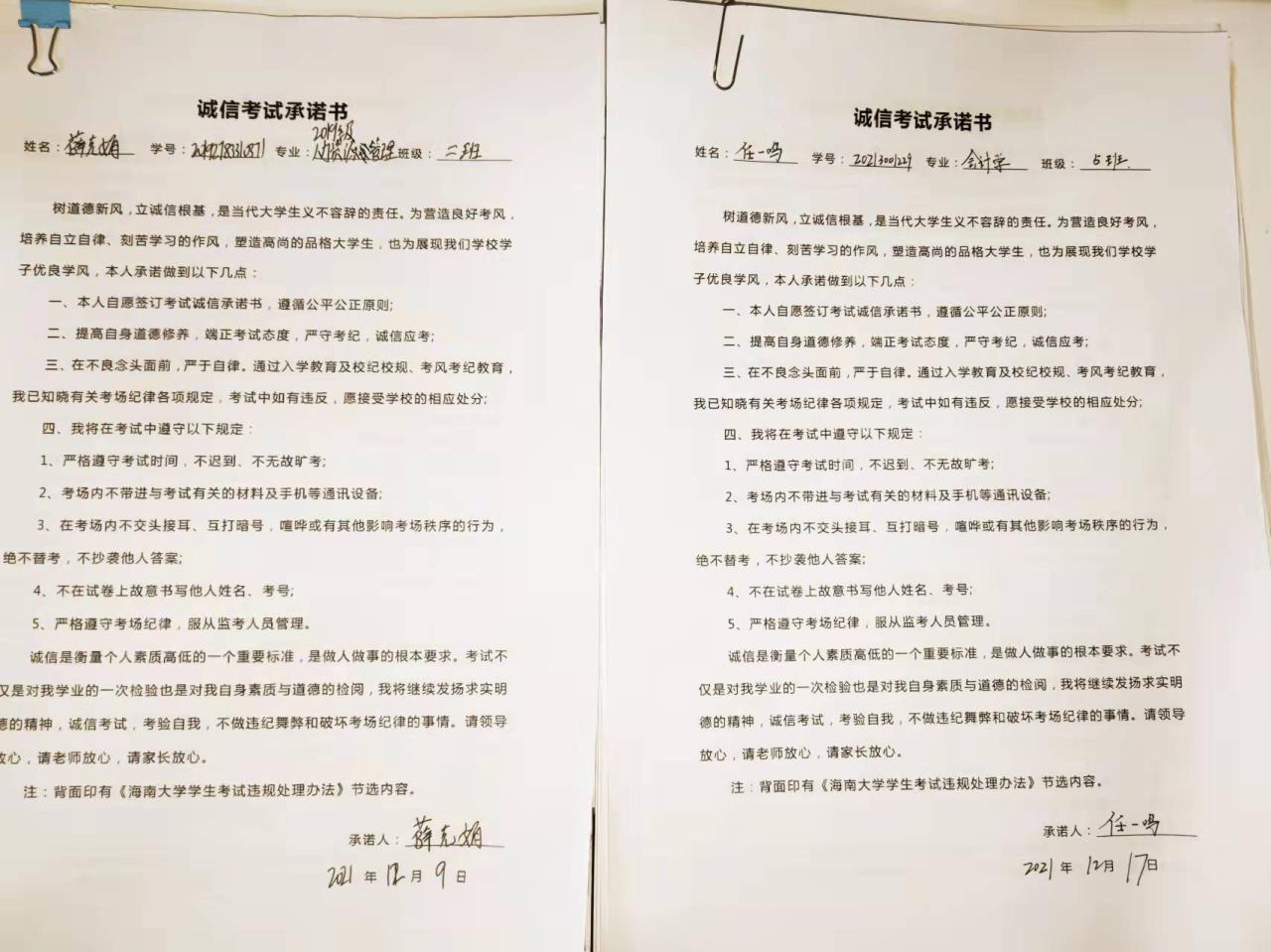 在考试前,要求各班级召开“诚信考试”主题班会,组织学习了《海南大学课程考试考场规则》、《海南大学学生考试违规处理办法》,引导广大学生认真学习、诚信考试、诚信做人,并联系案例组织学生讨论,强化学生对考试违纪危害性的认识,通过多渠道宣传确保学生对考试纪律、考场规则应知尽知,并签署了诚信考试承诺书。