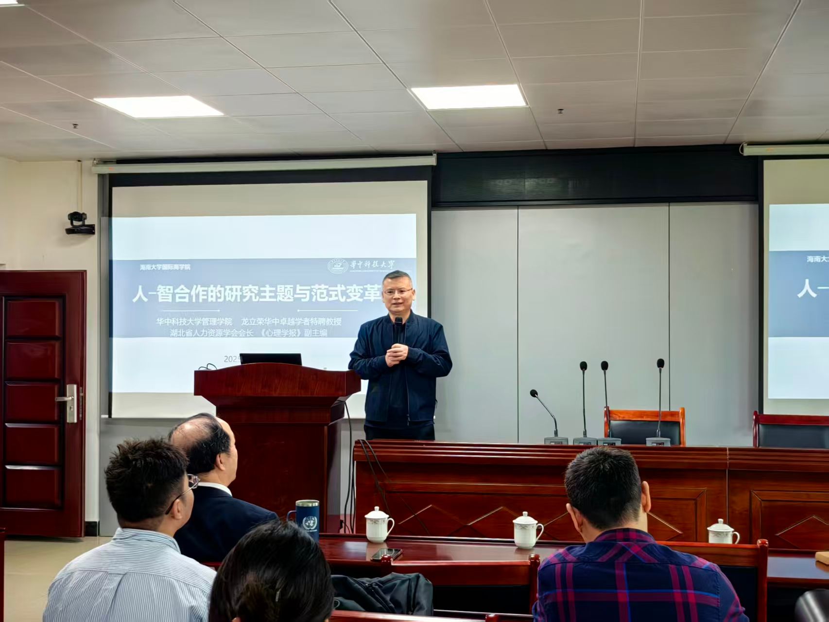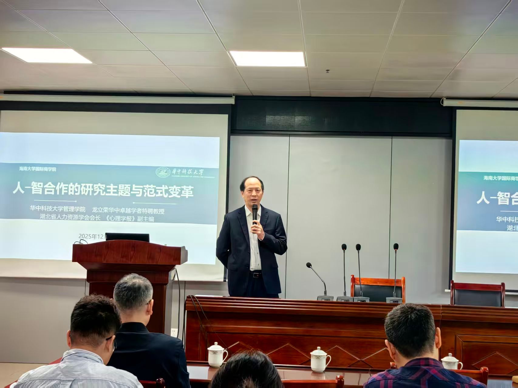 2025年12月24日上午,华中科技大学管理学院龙立荣教授应邀为海南大学国际商学院师生作《人智合作的研究主题与范式变革》专题讲座。讲座由海南大学学术副校长、国际商学院院长(兼)张克中教授主持,国际商学院师生到场聆听。