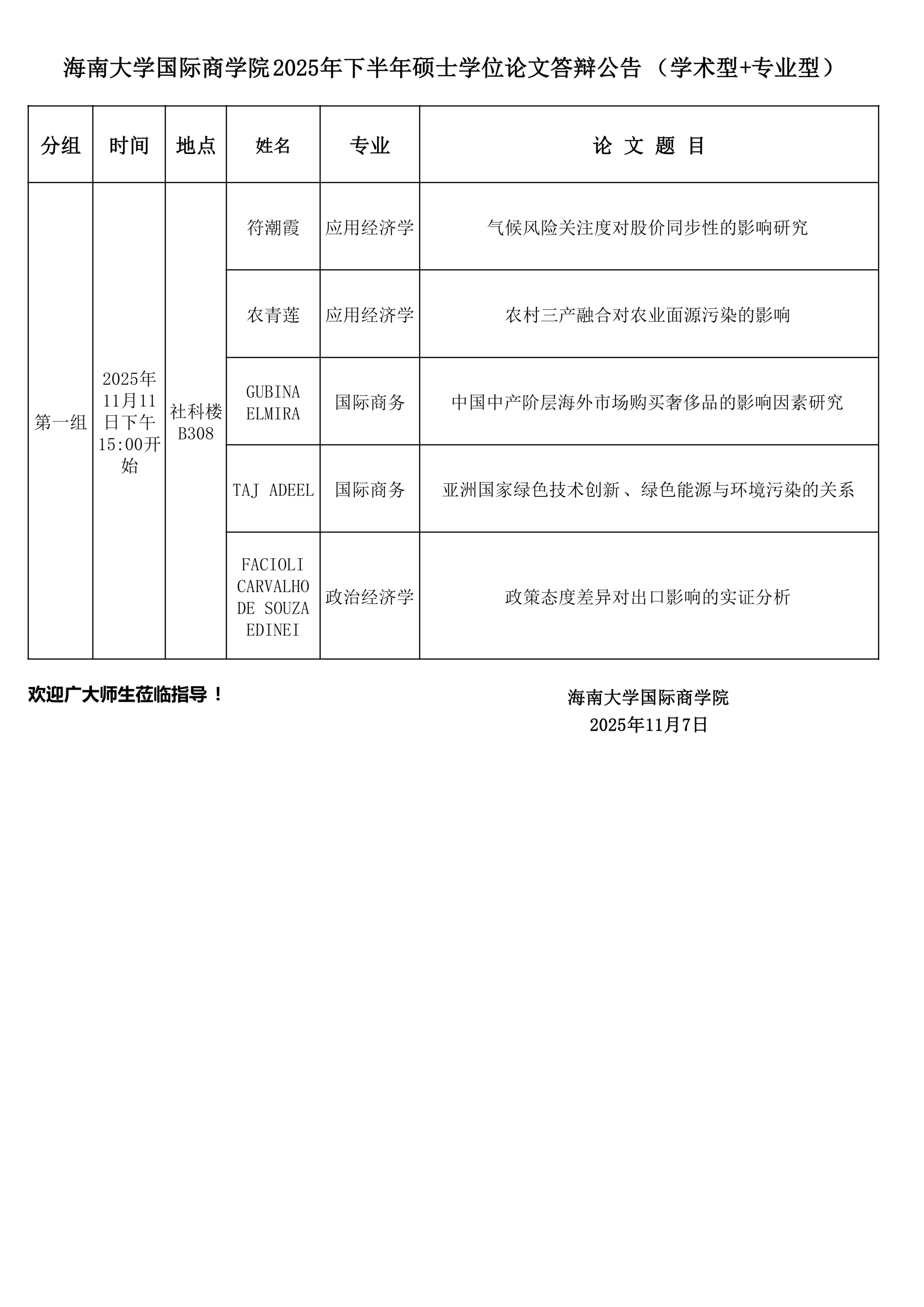 海南大学国际商学院2025年下半年硕士学位论文答辩公告(学术型+专业型)