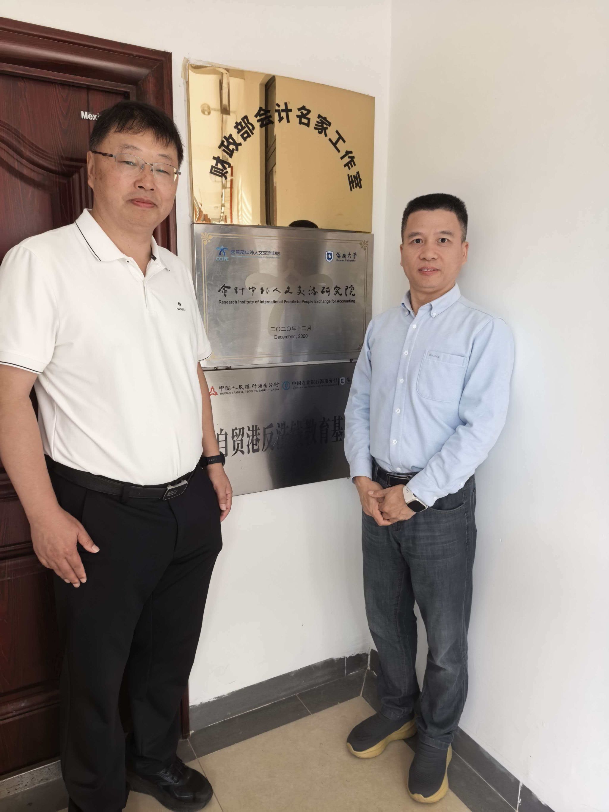 图6:许能锐副院长与刘俊勇教授在海南大学会计中外人文交流研究院办公室合影留念